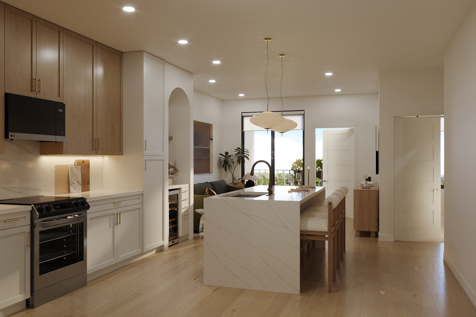 The interior features 9' ceilings, LVT wood flooring, plush carpet in bedrooms, and large walk-in closets. The kitchen is a chef's dream with quartz waterfall countertops, full quartz backsplashes, LG stainless steel appliances, a butler pantry, a coffee bar, and 52" custom upper cabinets with soft close drawers and under-cabinet lighting.