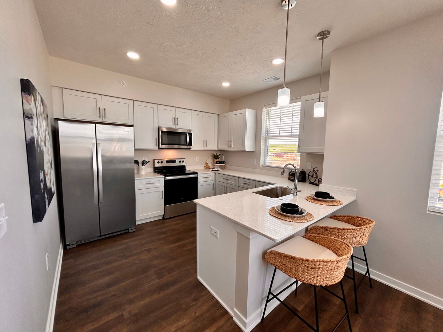 2. Modern Kitchen: The kitchen features modern appliances, including a stainless steel refrigerator, stove, dishwasher, and microwave. Ample cabinet and countertop space provide you with all the room you need to whip up delicious meals.