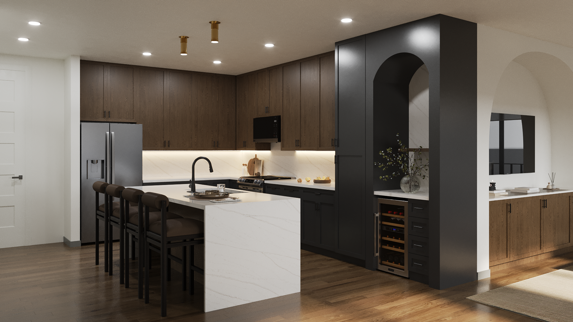 The interior features 9' ceilings, designer roller shades, and LVT wood flooring, creating a spacious and elegant living space. The kitchen is a chef's dream with quartz waterfall countertops, full quartz backsplashes, LG stainless steel appliances, and a butler pantry & coffee bar. The 52" custom upper cabinets with soft close drawers and under-cabinet lighting add a touch of sophistication.